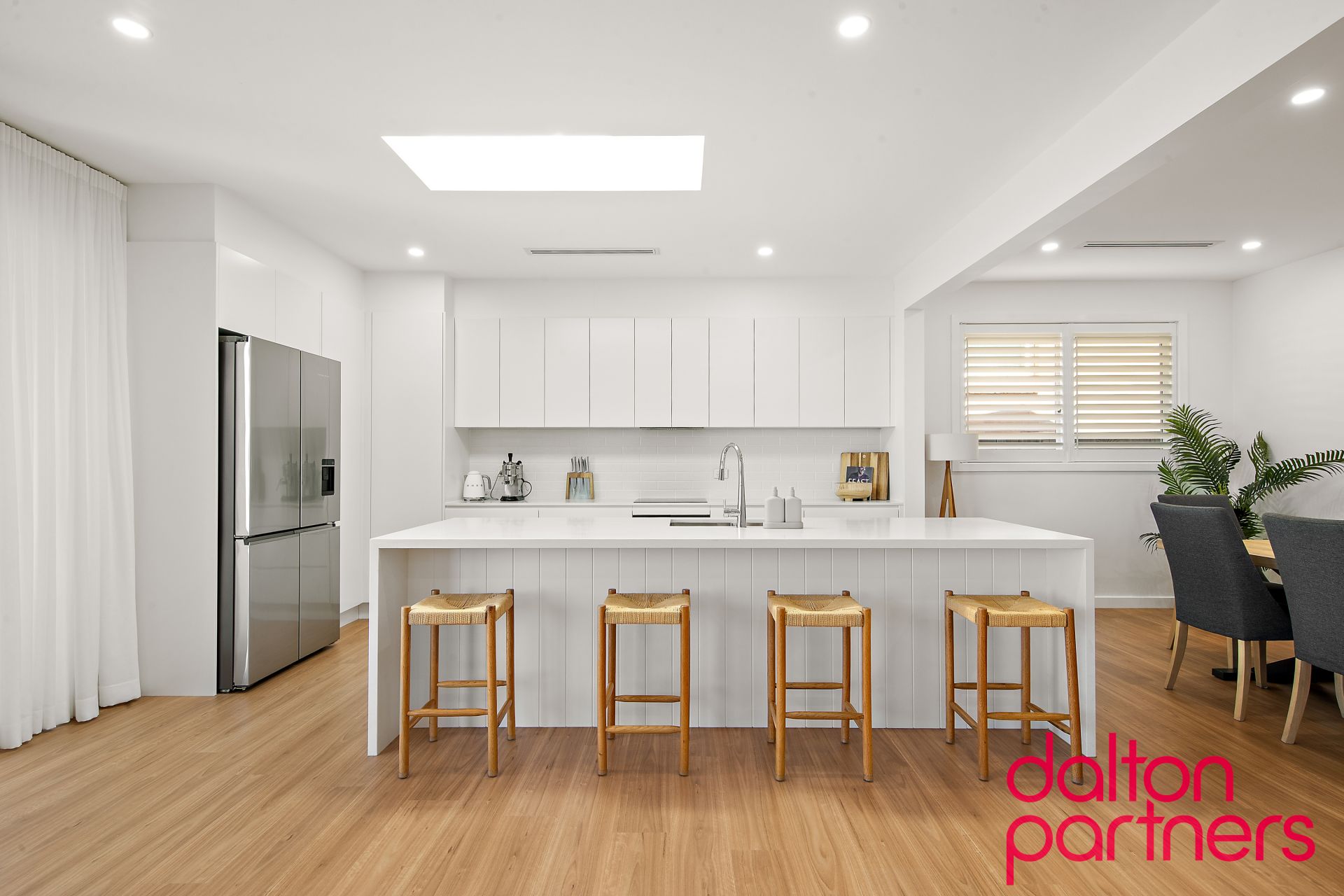 * Skylit Caesarstone island kitchen features handle-less cupboards for a seamless look