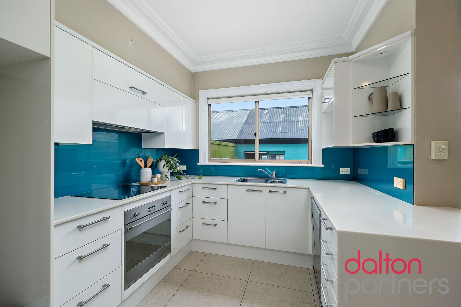 * Modern kitchen overlooking courtyard, powder room downstairs