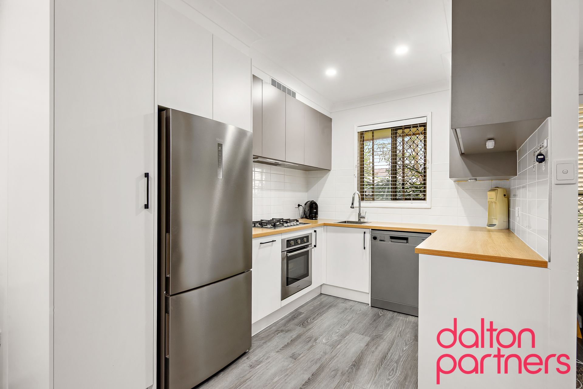 * Chic kitchen features modern appliances, timber benchtops, and ample storage/counter space