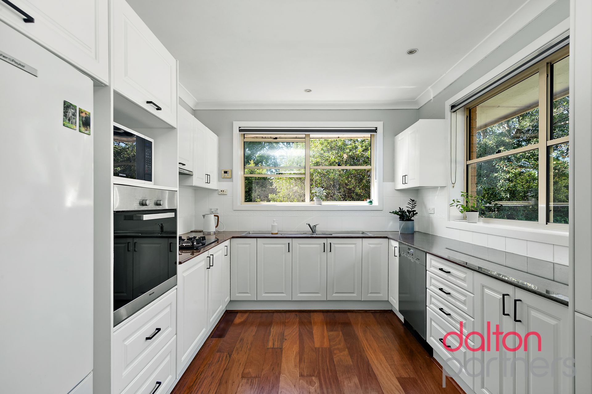 * The kitchen has stone benchtops, Miele dishwasher, gas cooktop, rangehood