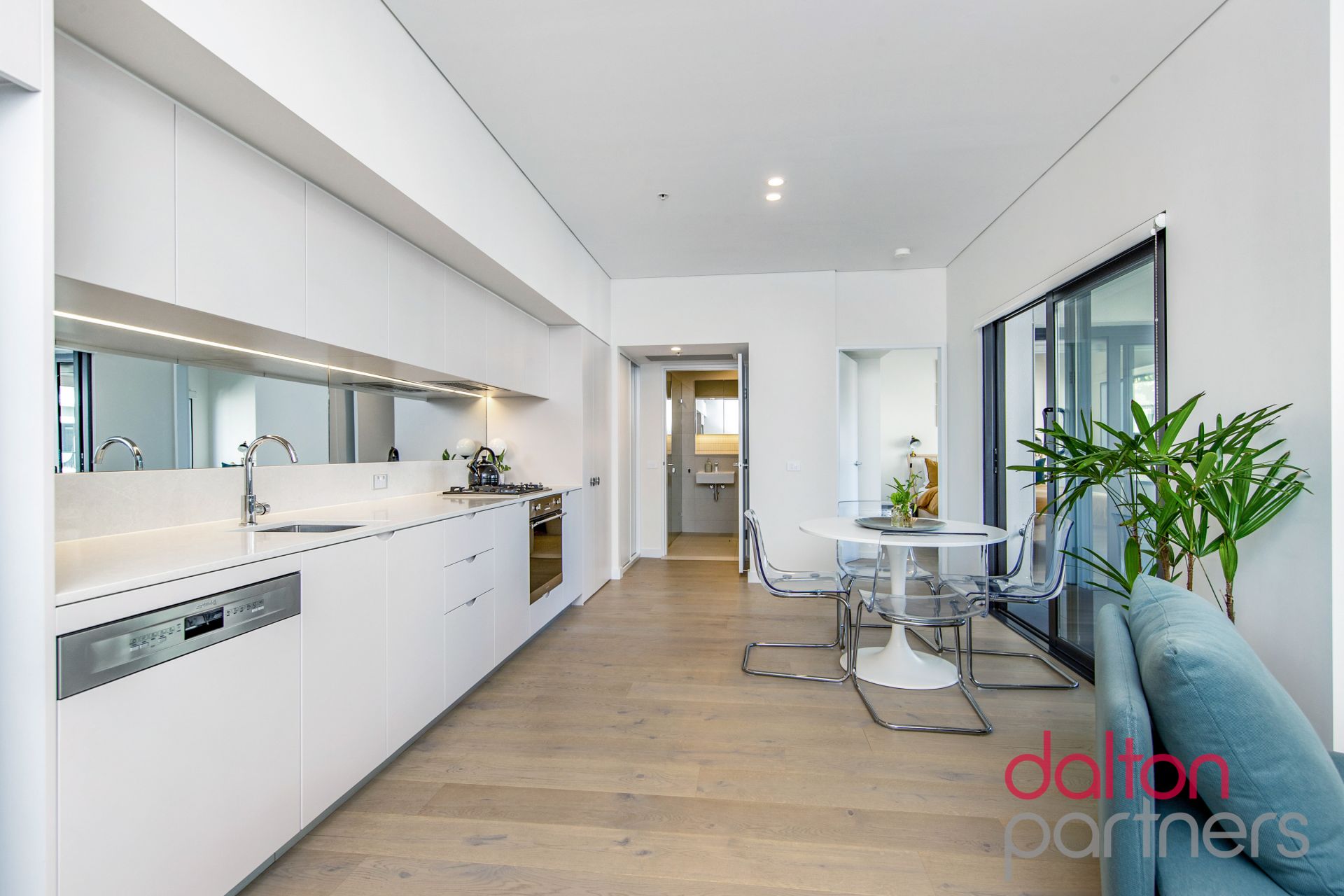 * Galley kitchen with a semi-integrated dishwasher and mirrored splash